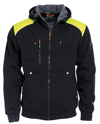 Brystlomme med glidelås. Romslige frontlommer. Armlomme. Hette med snøring. Ribb nederst på armene og i midjen.