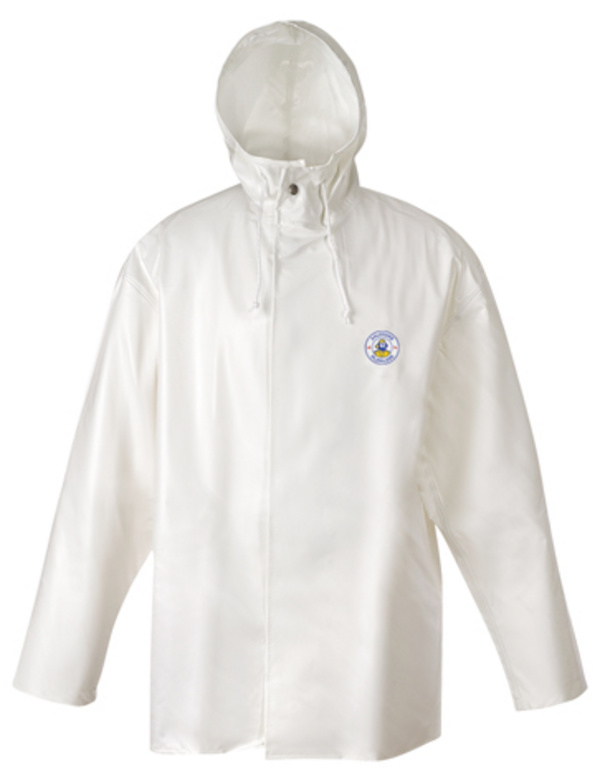 PVC belagt polyester 330 g/m2. Fett og kuldebestandig, glatt strikket bakside. hidrer absorbasjon av batkterievann.. Sydde og sveisede sømmer. Skjult knapping i front. Snorregulering i hette. Trykknapp i nedkant erm. Vaskes på 60 grader.
