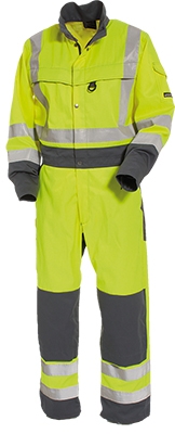 Kjeledress High-Vis med 3-nålssøm. Knepping i front med skjult toveis glidelås. Brystlommer med klaff og D-ring. Mobillomme på venstre arm. Justerbar ribb i midjen. Legg i ryggen. Stikklommer med gjennomgang. Baklommer. Tommestokklomme med pennelommer. Kneputelommer justerbare i to høyder. Trykknappjustering ved mansjett.