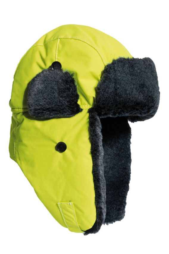 Varm og god vinterlue i fluoriserende gul med fuskepels.